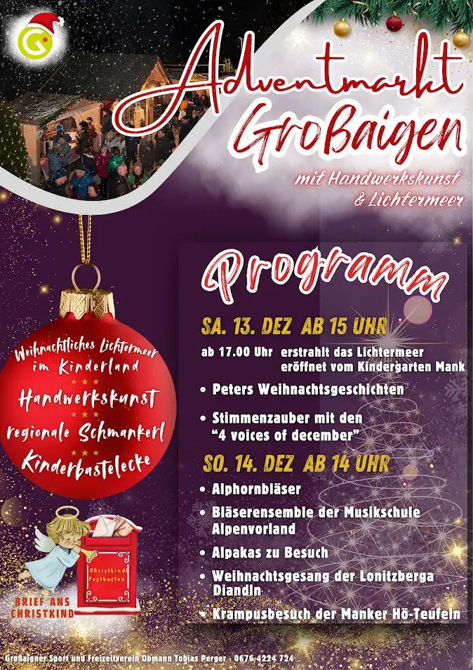Mit seinem Lichtermeer, dem vielfältigen Kunsthandwerk und dem besonderen Kinderprogramm ist der Adventmarkt Großaigen ein Ort zum Verweilen, Genießen und Einstimmen auf die Weihnachtszeit.